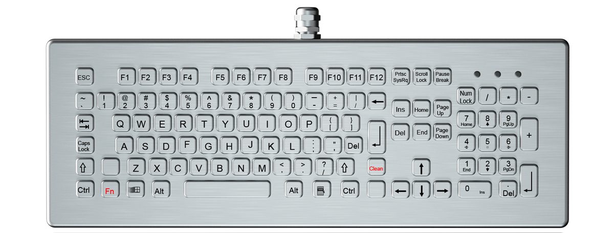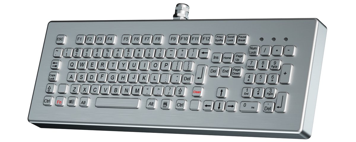 K-TEK-A396KP-FN-DT-DWP промышленная клавиатура из нержавеющей стали с повышенной степенью защиты IP68, предназначенная для работы в суровых условиях. Устойчива к воздействию воды, пыли, масел и агрессивных сред. Оснащена 108 клавишами, включая цифровой блок и функциональные клавиши F1–F12.