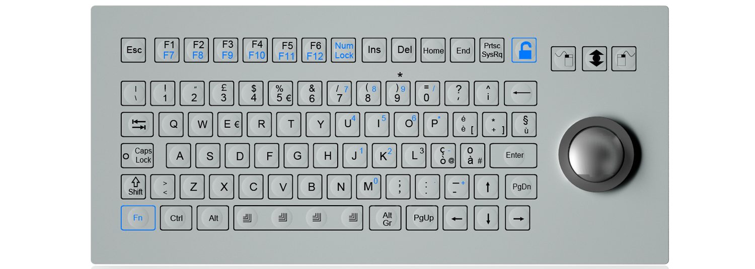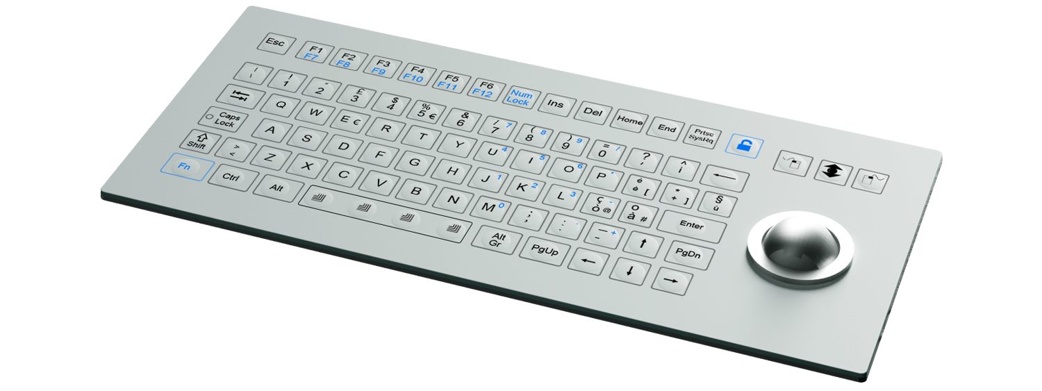 K-TEK-D333-OTB-FN-SW промышленная мембранная клавиатура на 81 клавишу с компактным форм-фактором и встроенным трекболом диаметром 38 мм (IP68, оптический, разрешение 800 DPI). Оснащена переключателями OMRON с коротким ходом 0,45 мм, что обеспечивает стабильный и быстрый ввод данных. Функциональные клавиши расположены в верхнем ряду. Есть комбинация FN+LOCK для блокировки клавиатуры во время очистки. Поверхность выполнена из антибактериального полиэстера, устойчивого к химическим веществам и царапинам, символы нанесены под плёнку и не стираются. Задняя панель из нержавеющей стали с матовой обработкой повышает прочность.