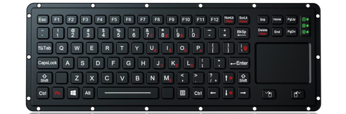 K-TEK-M315TP-FN-BL-NV-151B — это 89-клавишная промышленная клавиатура из силиконовой резины с двумя встроенными мышиными кнопками и интегрированным герметичным сенсорным тачпадом. Клавиатура оснащена военным PCB и переключателями carbon-on-gold с ходом клавиши 1.50 мм, что обеспечивает чёткий тактильный отклик и быструю работу без ошибок и постороннего шума. Поверхность клавиатуры покрыта антибактериальным защитным слоем, устойчивым к воздействию большинства жидкостей и химических веществ. Реализована функция FN + CLEAN для блокировки клавиатуры при очистке. Конструкция предусматривает заднюю установку на панель с применением тонкой усиленной алюминиевой пластины с монтажными отверстиями. Встроена регулируемая белая подсветка. Клавиатура соответствует стандартам MIL-STD-461G (EMC, EMI, EMS, ESD) и MIL-STD-810H (температура, влажность, вибрации, удары, дождь, пыль, соль, плесень и солнечная радиация).