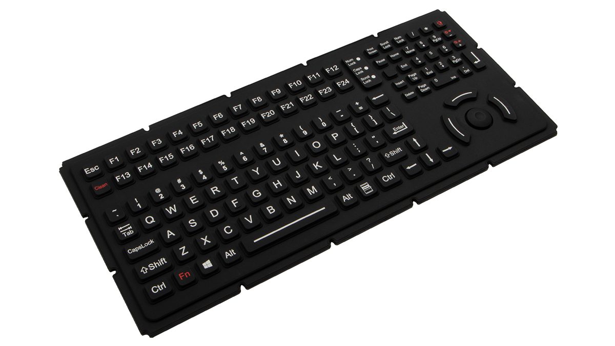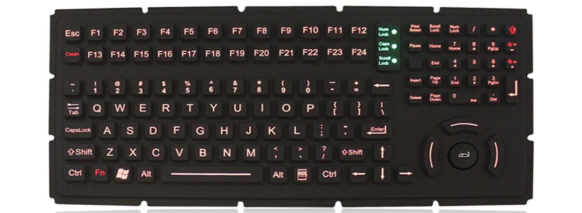 K-TEK-M365HP-KP-FN-BL-ML-EMC-OEM герметичная военная силиконовая клавиатура с защитой IP65, оснащённая 122 клавишами, включая 3 кнопки мыши, и встроенным Force Sensing Resistor (FSR)-указателем для точного курсорного управления без механического износа. Клавиатура выполнена на базе военной PCB с переключателями Carbon-on-Gold, обеспечивает чёткое тактильное ощущение и долгий срок службы. Поверхность устойчива к химикатам, маслам, воде и загрязнениям; имеется функция FN + CLEAN для блокировки клавиш при очистке. Задняя панель оснащена защищённой золотой PCB и резиновым верхним слоем для герметичного монтажа. Электроника защищена корпусом из нержавеющей стали. Подсветка — белая или красная. Соответствует стандартам MIL-STD-461G (EMC/EMI/ESD) и MIL-STD-810H (температура, вибрации, соляной туман, дождь, пыль, солнечное излучение и др.).