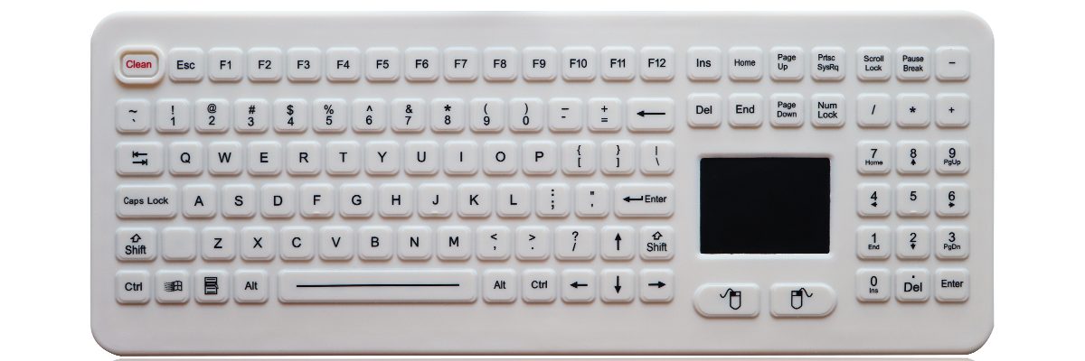 K-TEK-M399TP-KP-FN-DT медицинская силиконовая клавиатура с 108 клавишами и встроенным сенсорным тачпадом. Полностью герметичная конструкция класса IP68 обеспечивает устойчивость к влаге, пыли, химическим веществам и дезинфицирующим средствам, что делает устройство идеально подходящим для использования в медицинских, лабораторных и стерильных помещениях.