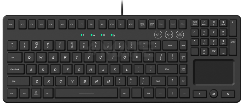 Клавиатура оснащена встроенным цифровым блоком NumPad и сенсорной панелью TouchPad с кнопками управления мышью, что позволяет использовать устройство без дополнительных периферийных манипуляторов. Поверхность выполнена из силикона, обеспечивающего герметичность, устойчивость к загрязнениям и возможность быстрой дезинфекции.